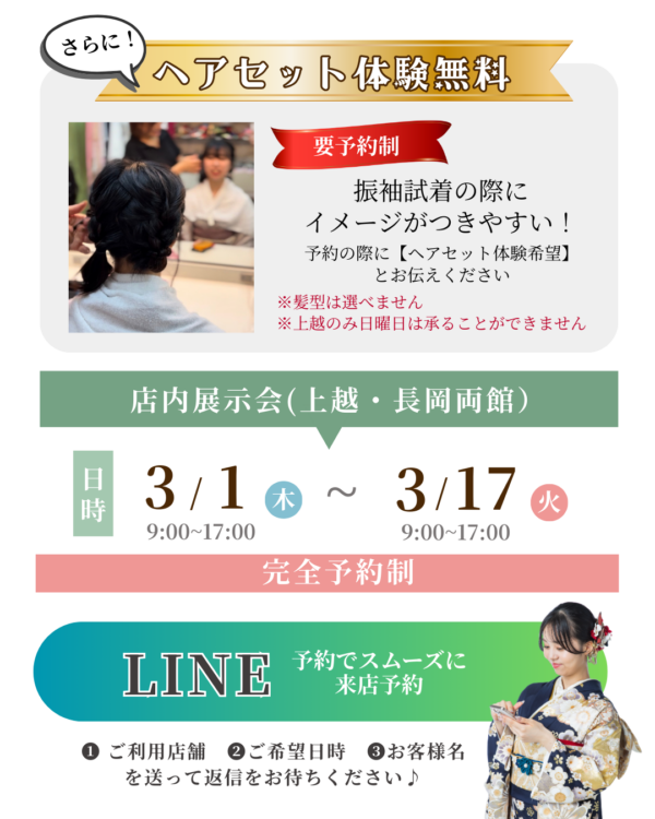 いまなら期間中のご予約で無料ヘアセット体験の特典もついています!